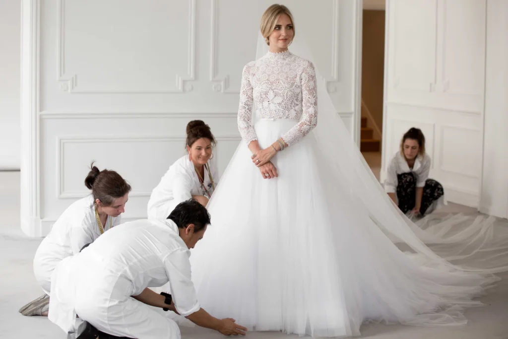 Chiara’s custom Dior constricted of an intricate embroidered bodice, a high neck line, a voluminous tulle skirt that had a slit in front so her slingback heels were visible. Her gown required around 400 meters of fabric and 1,600 hours of work.