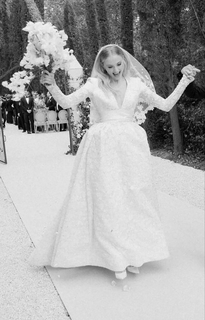 Sophie’s gown was custom made by the creative director of Louis Vuitton and featured a plunging V-neckline, long intricate lace sleeves, a wide sash belt and voluminous skirt etched with embellishments. Her tulle was floral embroidered with silk gazar and leather satin details.