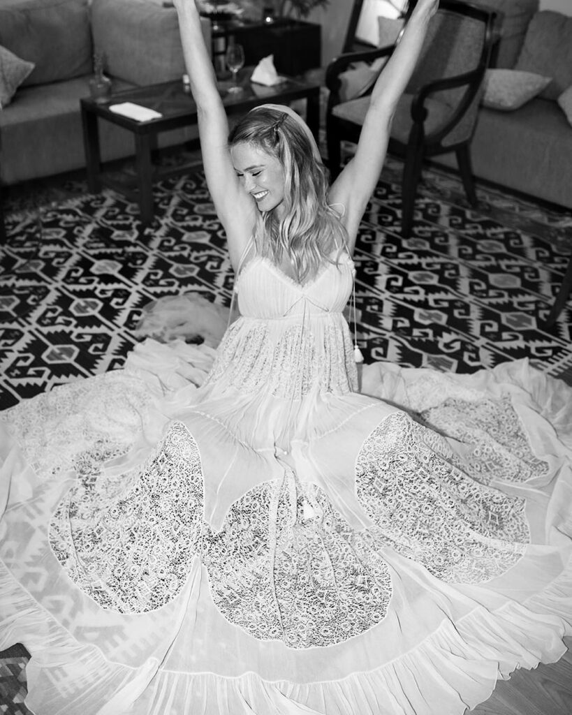 Choosing a departure from the traditional bridal attire, Refaeli made a striking statement in a Chloé gown that exuded sheer sophistication and intricate artistry. Complementing the non-traditional choice, her half-up hairstyle with soft waves effortlessly harmonized with the bohemian vibe of the dress, creating a uniquely captivating bridal look.