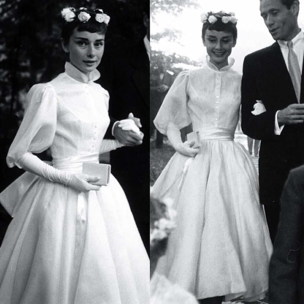 Pierre Balmain’s creation, a tea-length dress adorned with a satin sash and ballgown sleeves, graced Audrey Hepburn elegantly. Complemented by elbow-length gloves, the modest high-neck gown not only reflected the actress’s innocence but also showcased her sophisticated style impeccably.
