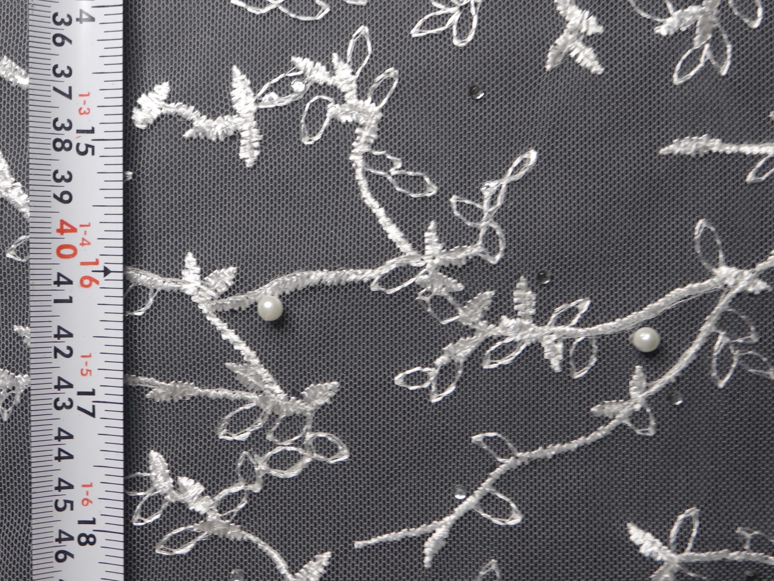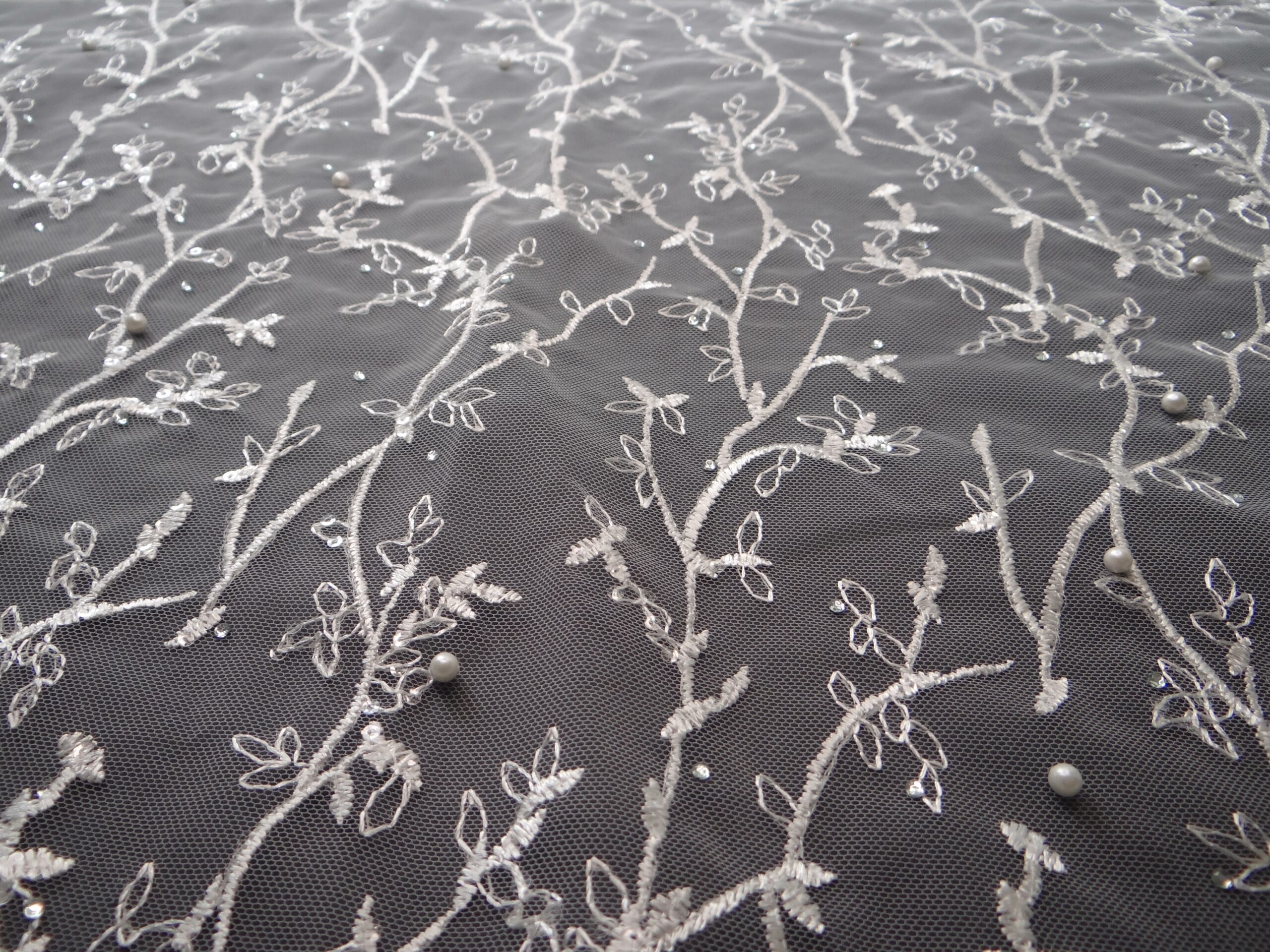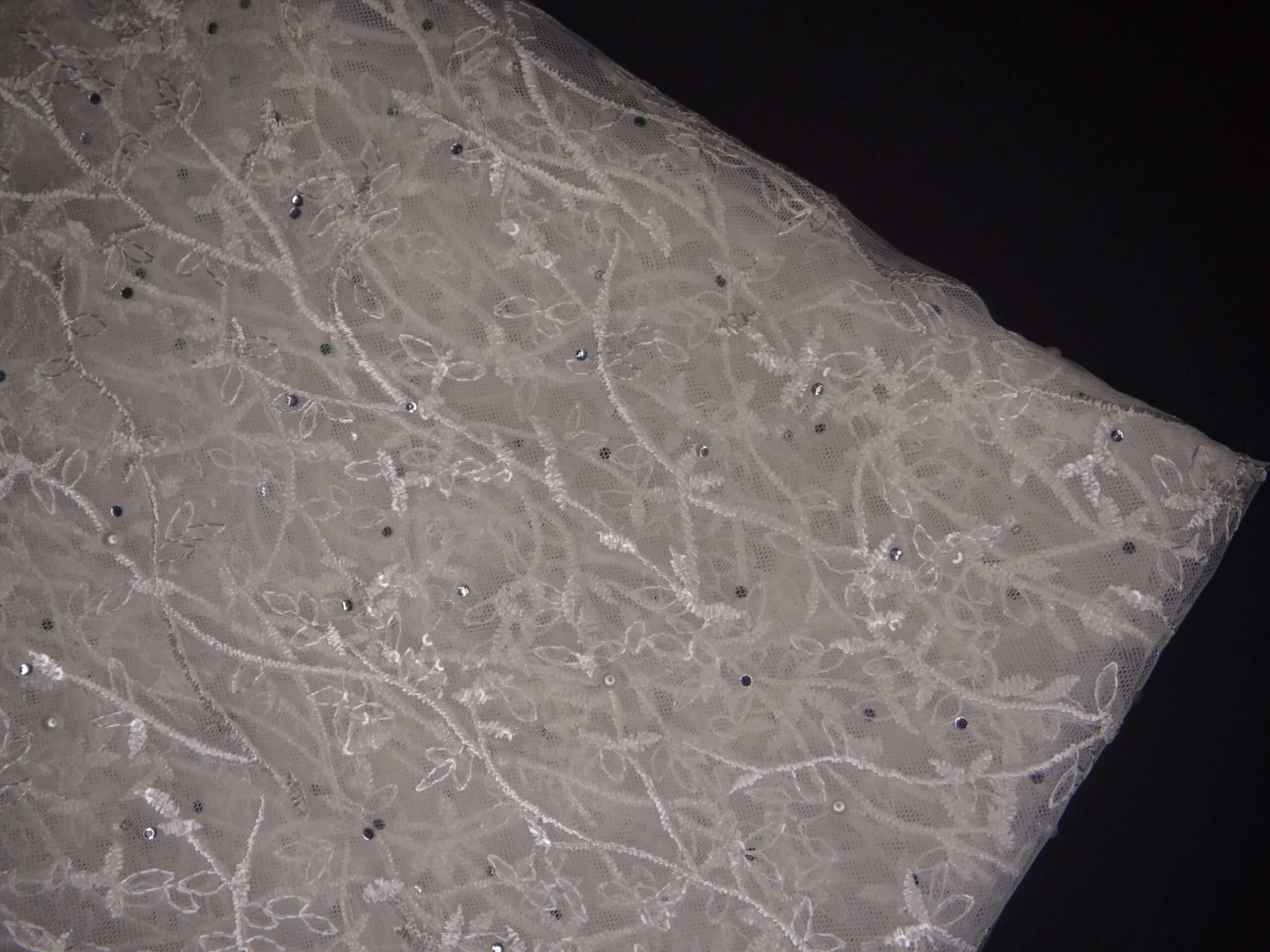 This beautiful fabric is studded with white pearls and glitter scattered across that makes the entire fabric come together with panache without being too cluttered.