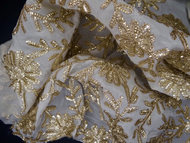 Heavy golden intricate floral pattern that is embossed throughout the fabric.
