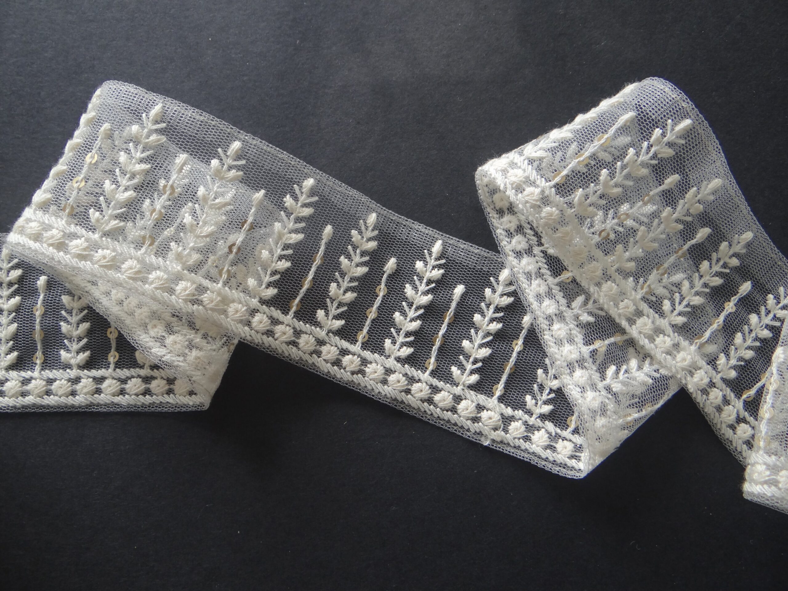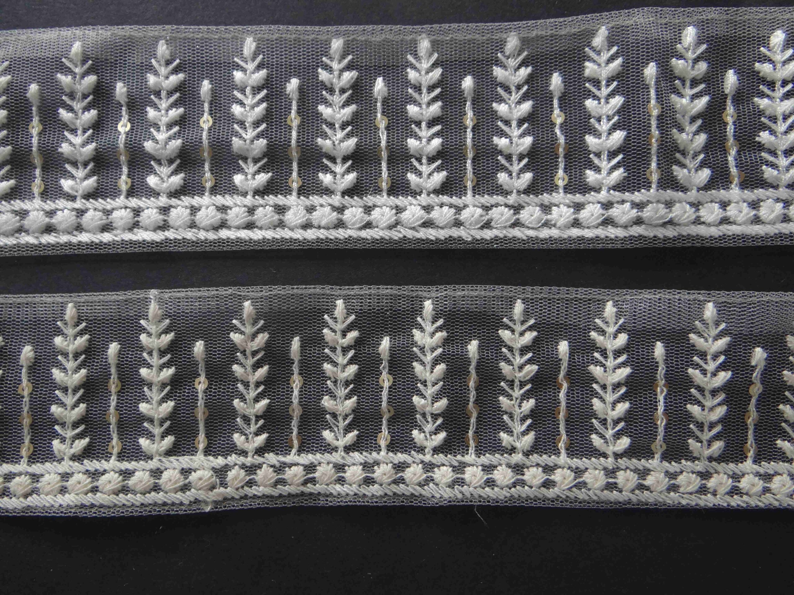 Stunning lace with soft patterns of leaves and golden sequins to provide a less cluttered look. Available in 2 colours; White and Pearl White.